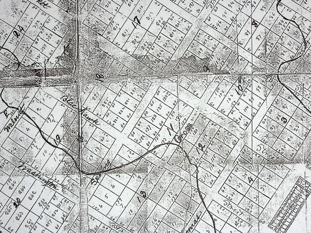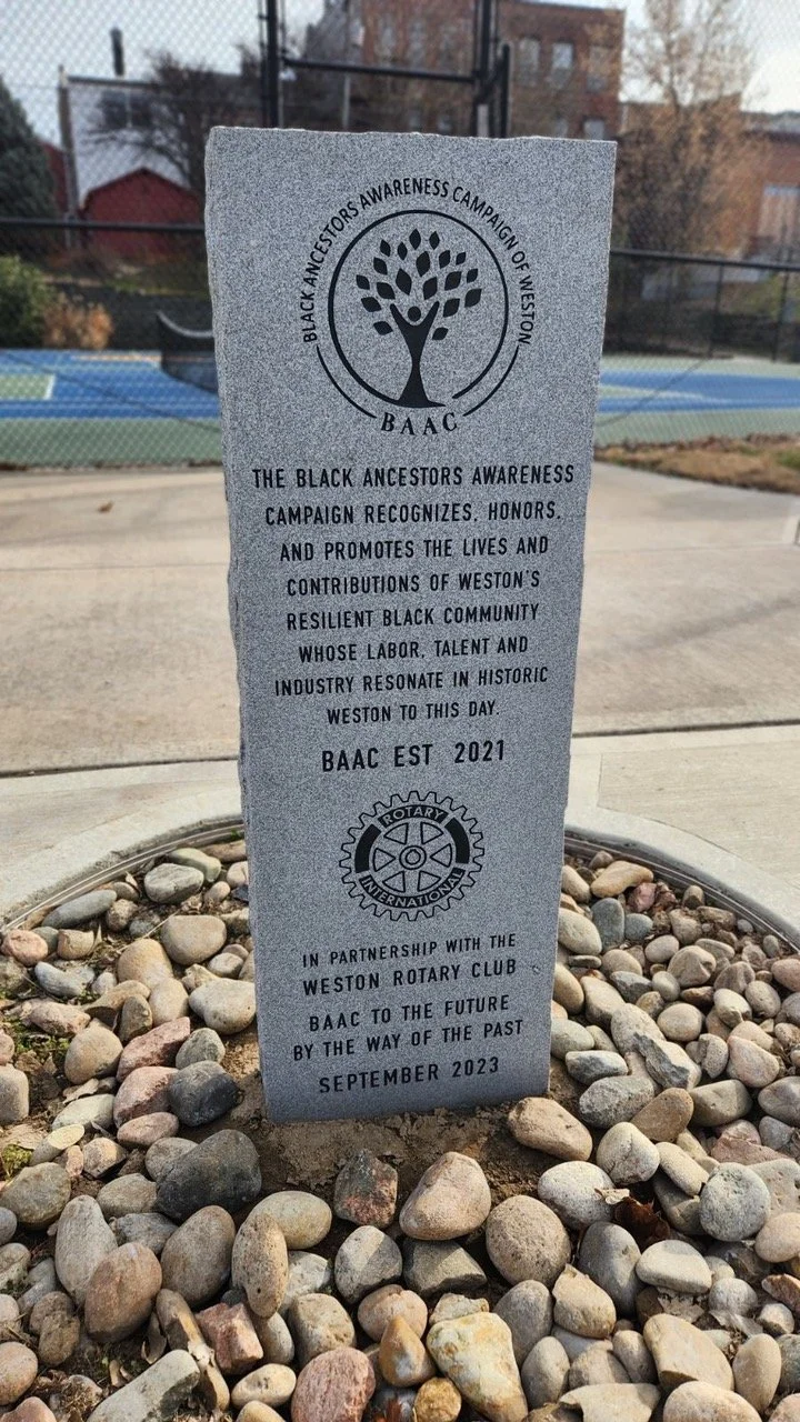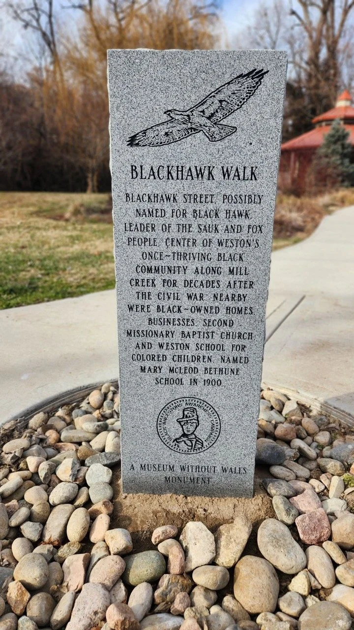 This 1844 section of this Weston Township map shows the continuation of Blackhawk Street, twice interrupted by the wandering Mill Greek. During the decades following the Civil War, this area, prone to flooding on either side of Blackhawk Street, was home to many of Weston's Black Community members and entrepreneurial endeavors. Due to access to the Second Missionary Baptist Church and the Weston School for Colored Children, renamed Mary McLeod Bethune School in 1900, baptisms and neighborhood social gatherings were often held here.
